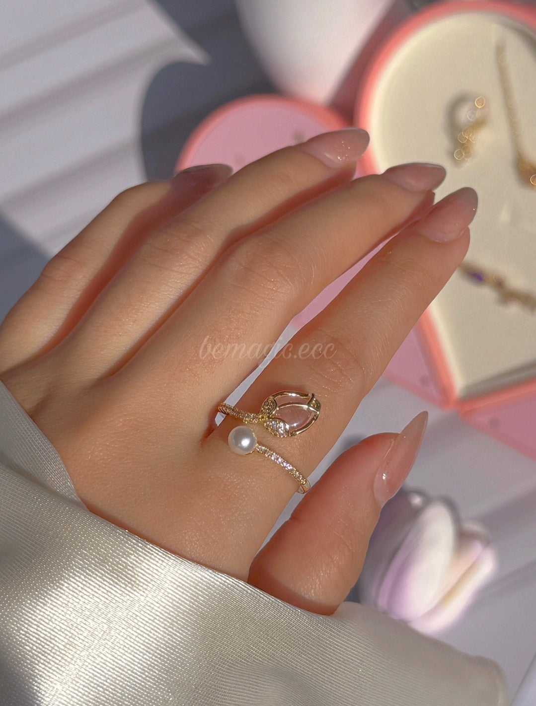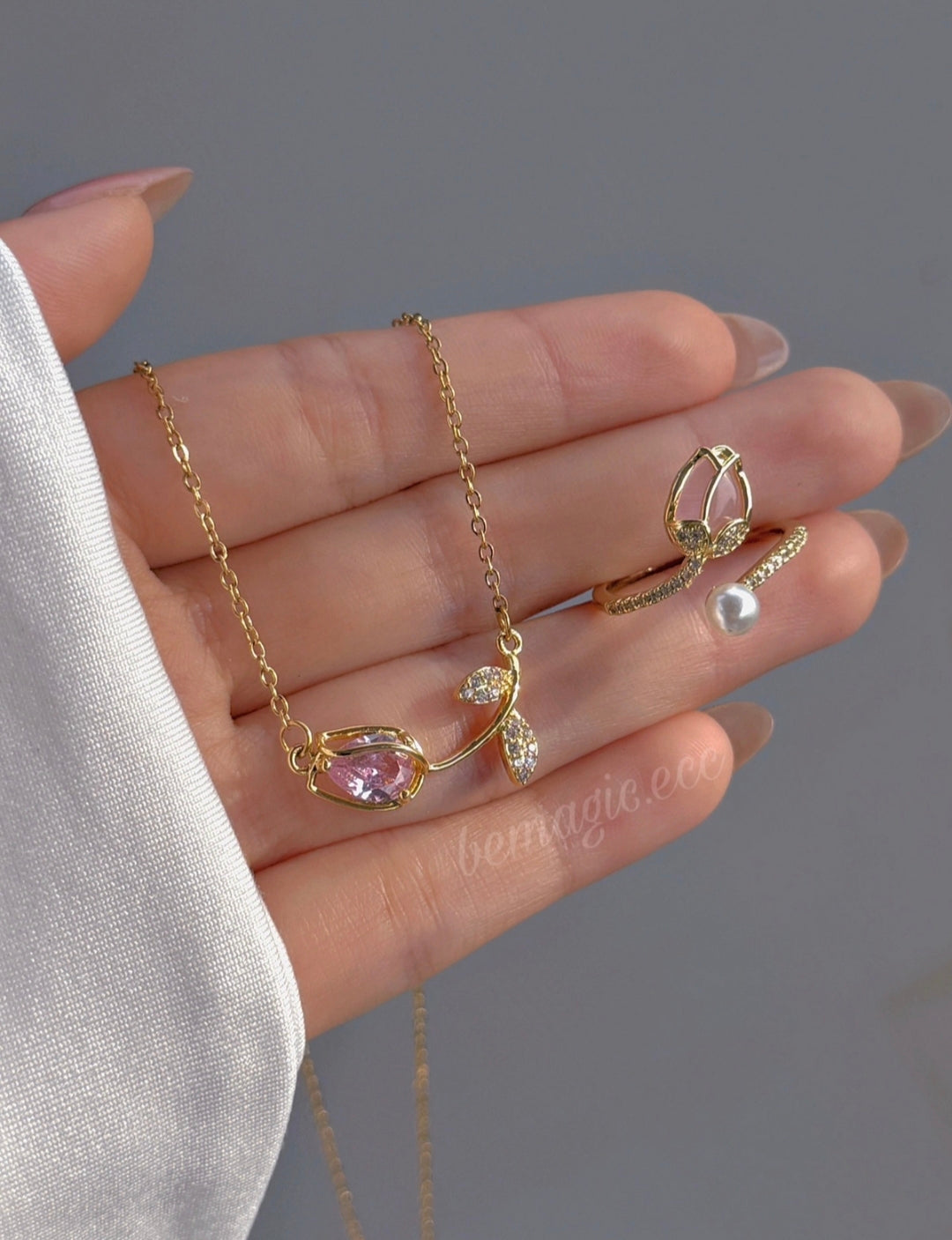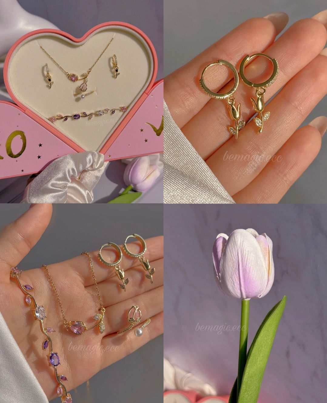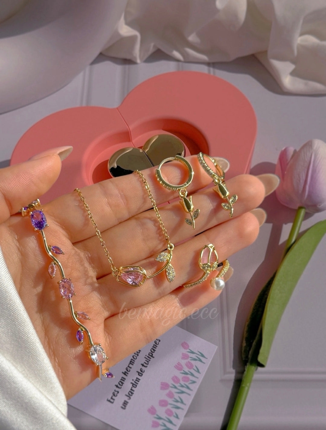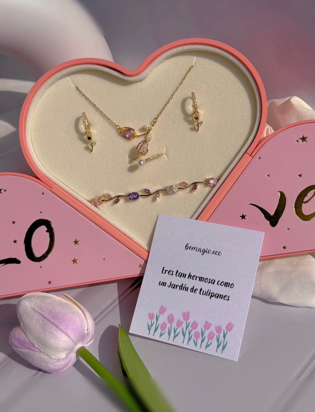 Hermoso set inspirado en la primavera que incluye collar, aretes, pulsera y anillo con delicados detalles de tulipán, presentados en un elegante cofre en forma de corazón. Un regalo romántico y lleno de significado, perfecto para sorprender.