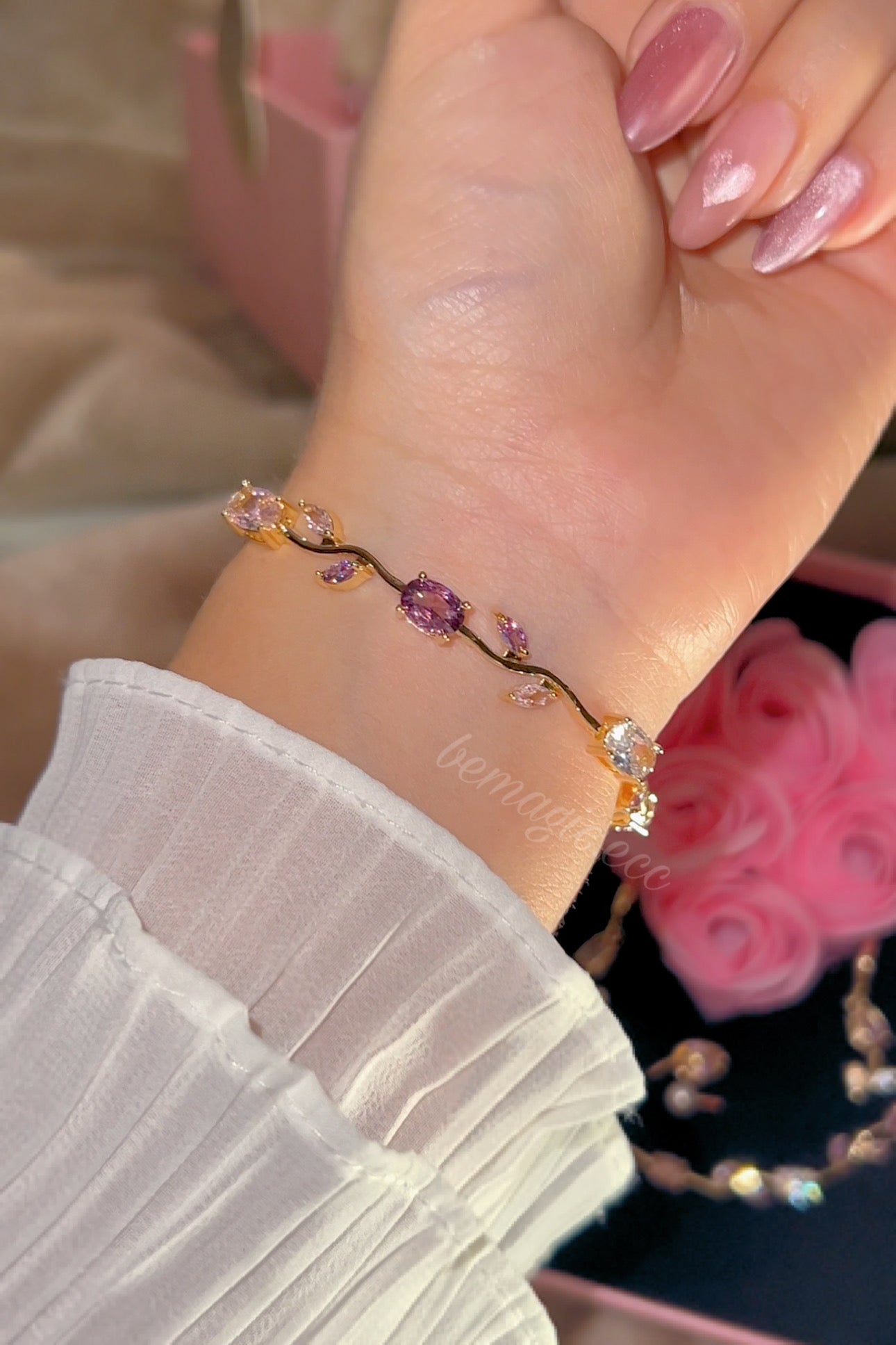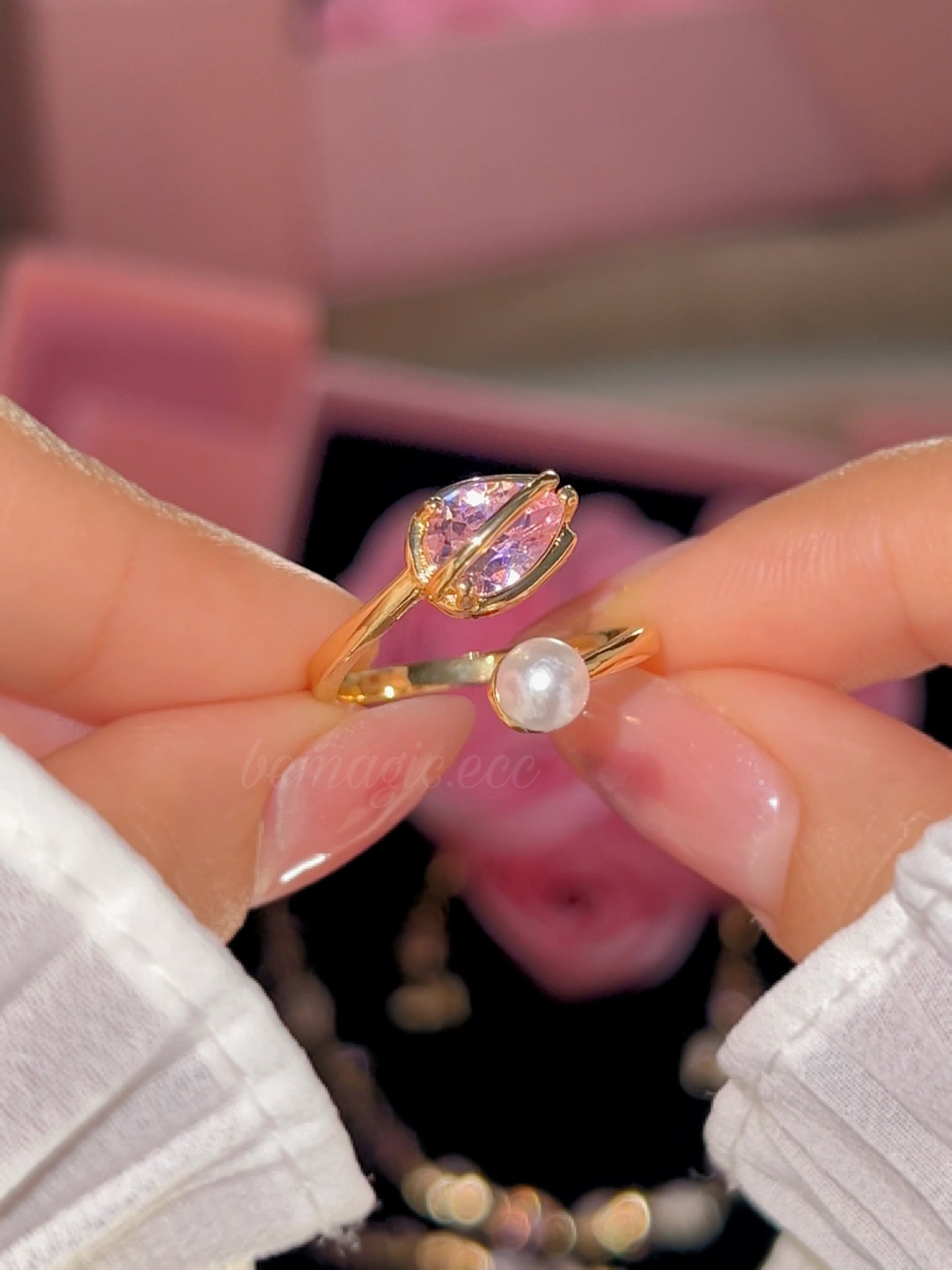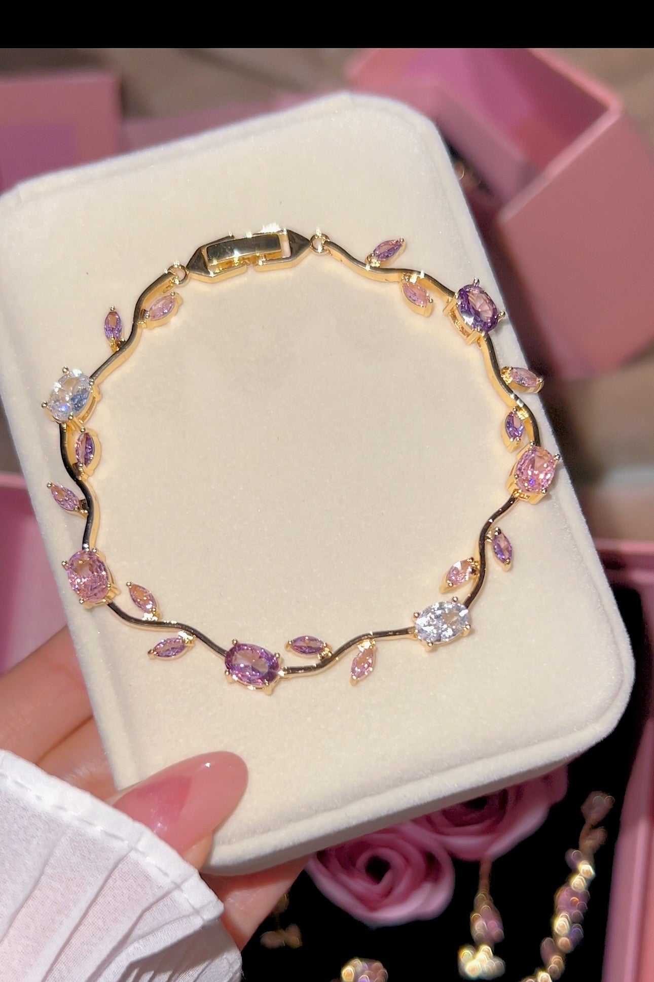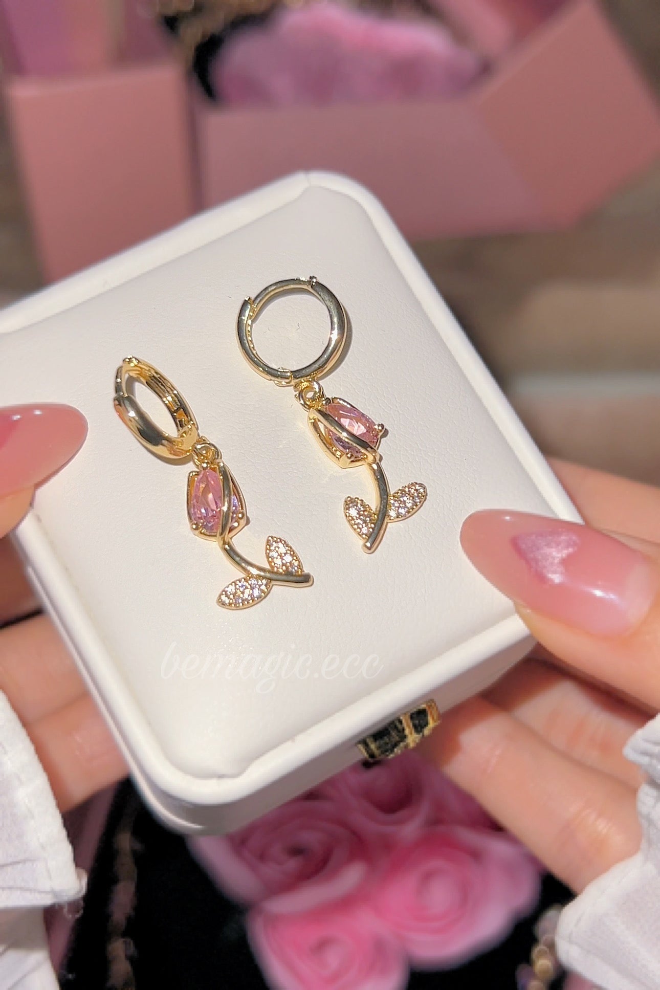 Este hermoso set en tono rosado incluye collar, aretes, brazalete y anillo en forma de tulipán, cuidadosamente presentados dentro de un delicado cofre de rosas, simbolizando amor, elegancia y detalles que perduran.